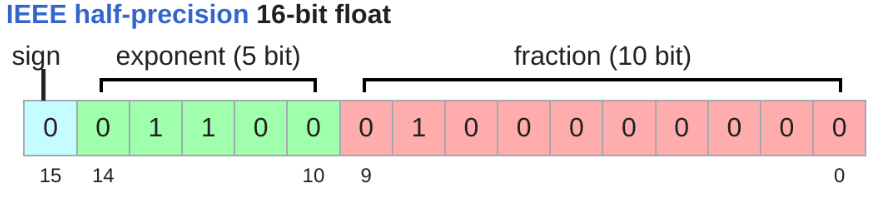 符号位依然为 1 位,指数位和尾数位各自位数变为原来的一半。这相当于将原先的 FP32 缩小为一半的比例,因此内存大大减小了,训练速度也能变快很多。具体而言,一个 FP16 数据占 2 个字节。