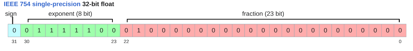 FP32 由 1 符号位,8 指数位和 23 尾数位(分数位)构成,一个 FP32 数据占 4 个字节。其能表示的范围大小由指数位决定,分数的精度由尾数位决定。