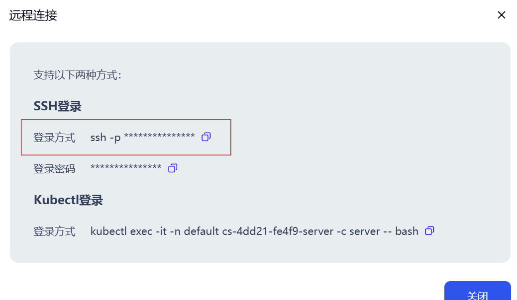 打开英博云的开发机页面,点击开发机的远程连接,复制登陆方式命令: