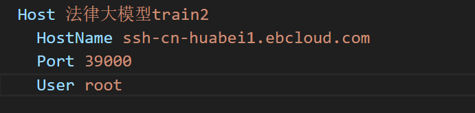 Host 是远程服务器名字,可以自己取。假如我们复制的 ssh 登录方式是: ssh -p 39000 root@ssh-cn-huabei1.ebcloud.com ,那么 HostName 就是 @后面的内容,Port 是 ssh - p 后面的数字,User 是 @前面的 root。